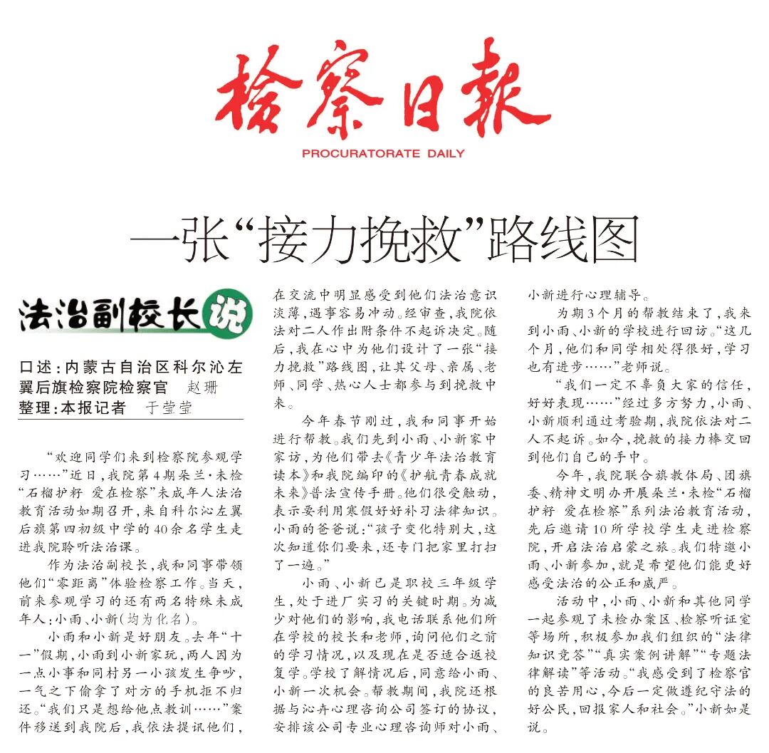 今年,我院联合旗教体局、团旗委、精神文明办开展朵兰·未检“石榴护籽 爱在检察”系列法治教育活动,先后邀请10所学校学生走进检察院,开启法治启蒙之旅。我们特邀小雨、小新参加,就是希望他们能更好感受法治的公正和威严。